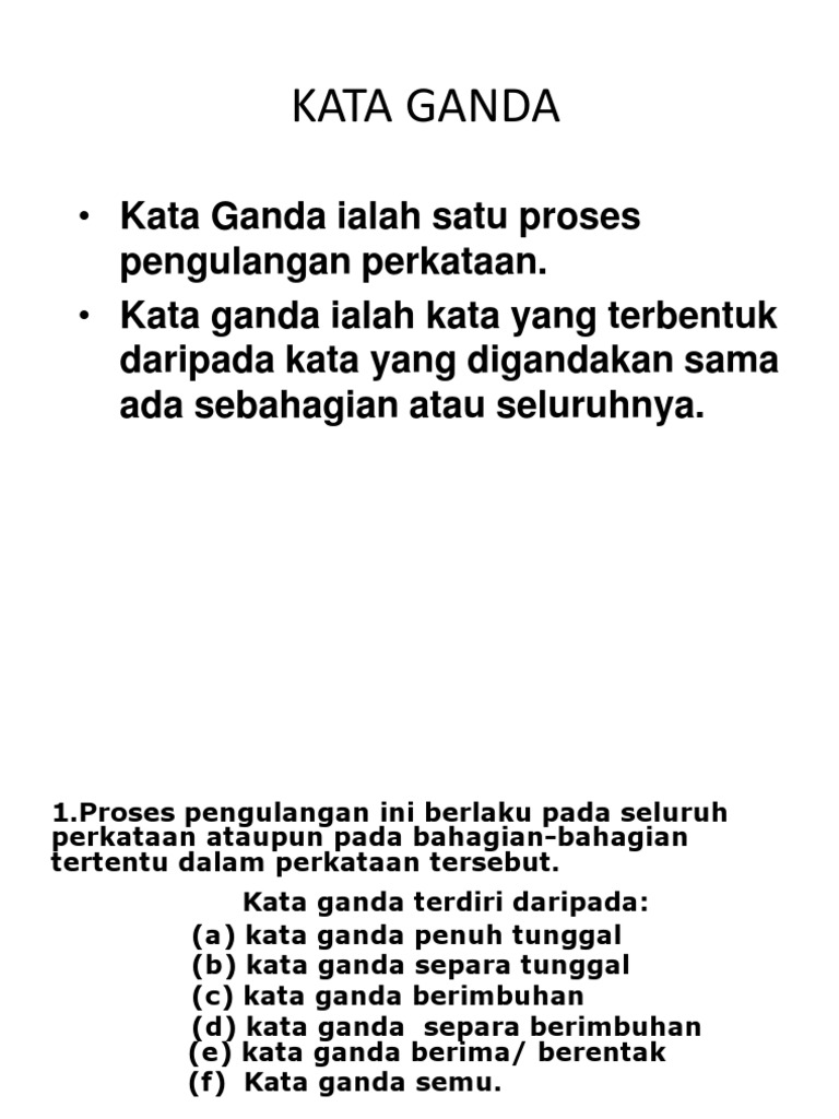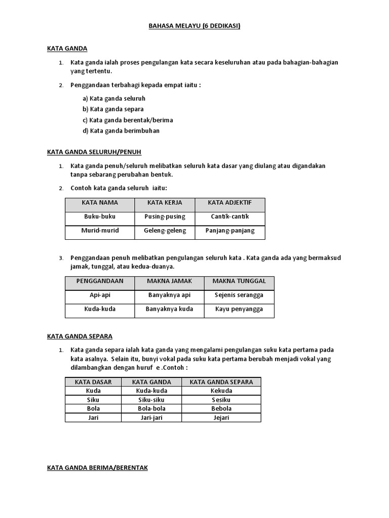 Adapun beberapa contoh kata hai!murid muridbelajarmarikata ganda penuh kata ganda penuh berimbuhan kata ganda majmuktingkatan 1 tatabahasatingkatan 1 tatabahasa apa itu. Want to read all 16 pages? Salah satunya adalah kata ganda berimbuhan. Penulisan imbuhan dilakukan serangkai dengan bentuk dasarnya. Kata ganda penuh ini membawa maksud jamak (banyak).
