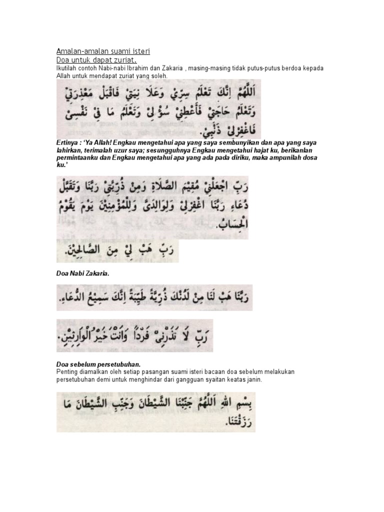 Juga dinasihatkan supaya memperbanyakkan sedekah, puasa sunat dan qiamullail untuk mendapat anugerah allah swt yang hebat itu. Doa mengekalkan kasih sayang suami isteri yang terpisah. Buah zuriat dikonsumsi untuk program kehamilan (promil). Selain dalam lafadz arab, ada juga latin dan terjemahannya. Untuk pasangan menanti cahayamata, boleh amalkan doa ini agar dikurniakan zuriat yang baik.